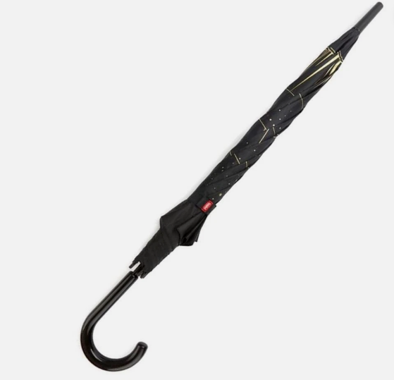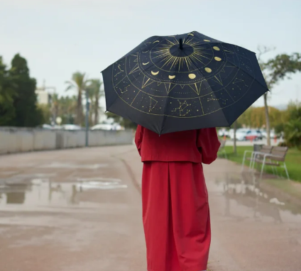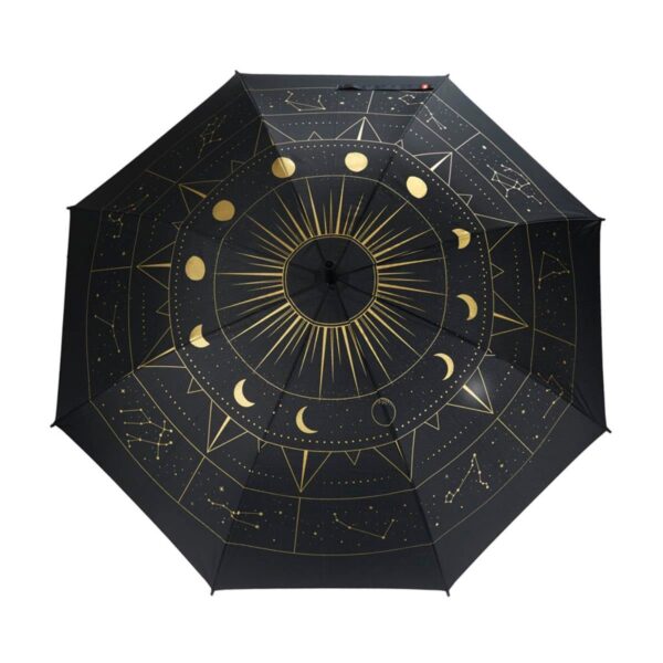 Merrni yjet me vete në çdo ditë me shi! Kjo çadër elegante ka një dizajn të jashtëm të zi të cilin e zbukurojnë yje dhe konstelacione të arta, duke krijuar një pamje të rafinuar dhe të veçantë. Pjesa e brendshme mbetet e zezë klasike, duke e bërë këtë çadër një aksesor stilistik dhe të përjetshëm për ata që duan një prekje celestiale.