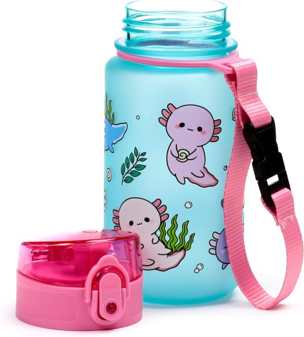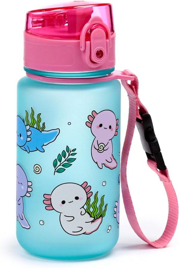 Shishja Adoramals Axolotl Pop Top 350ml është një shishe praktike dhe e qëndrueshme, e punuar nga SK Ecozen, polipropilen dhe silikon, me një rrip të shpejtë nga poliesteri për mbajtje të lehtë. E sigurt për ushqim, pa BPA dhe e ripërdorshme, nuk është e përshtatshme për pije të gazuara apo të nxehta dhe nuk rekomandohet për larje në lavastovilje. Kapaciteti: 350 ml. Përmasat: 18 x 6.5 x 6.5 cm.