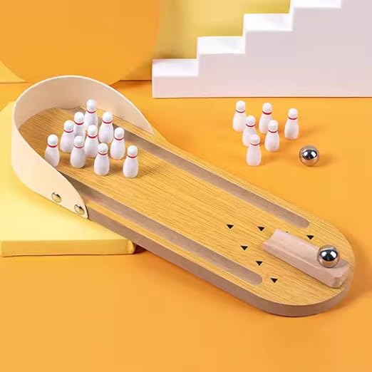E punuar nga druri natyral, kjo lojë bowling ka 10 shkopinj bowling prej druri dhe një top metalik për argëtim pa fund. Përmasa: rreth 30 cm gjatësi, ideale për tavolina, tavolina pune ose çdo sipërfaqe të sheshtë. Baza solide prej druri me mbrojtës të lakuar parandalon që topi të bjerë jashtë rrugës së bowling-ut. Ndërsa ndërtimi i lehtë mundëson transportin e lehtë mes shtëpisë, zyrës ose grumbullimeve shoqërore.Përmasat: 8 x 29.6 x 5 cm;
