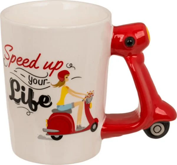Filxhani me formën e skuterit dhe dorezë – Stili vintage për kafen tuaj. Ky filxhan prej dheu sjell sharmin klasik të një skuteri, perfekt për adhuruesit e mjeteve retro dhe ata që dëshirojnë një prekje nostalgjie me pijet e ngrohta. I qëndrueshëm dhe plot personalitet, është zgjedhja ideale për të nisur ditën me një udhëtim në kohë. Vjen në përmasat 13.5 cm x 11 cm.