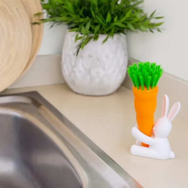 Ky aksesor i shtruar për kuzhinën ka një dizajn të veçantë me një furçë në formë karrote, e cila është vendosur me dashuri në duar të një lepurushi, duke sjellë funksionalitet dhe një prekje lozonjare në punët tuaja të përditshme. Mbajtësi i lepurushit është i ëmbël dhe funksional, duke bërë të mundur ruajtjen higjienike të furçës tuaj, duke e mbajtur atë të thatë dhe gjithmonë në arritje. Furça me formë karrote është projektuar për një kapje komode dhe është e përsosur për pastrimin e yndyrës dhe papastërtive në enë, tenxhere dhe tiganë. E përkryer si dhuratë për adhuruesit e lepurushëve ose për dhurata shtëpie, ky aksesor është i bërë nga materiale të cilësisë së lartë, duke kombinuar estetikën dhe efikasitetin në çdo përdorim.
