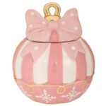 Kjo kuti dekorative qeramike ka formën e një cupcaku të madh dhe është e përshtatur për sezonin e Krishtlindjeve.Cupcake me vija vertikale rozë dhe të bardhë.Kapaku duket si krem i bardhë me sprinkles shumëngjyrëshe.Një snowman i vogël, me kapelë rozë dhe shall blu me të bardhë, vendosur mbi kapak.Ideal për ruajtjen e biskotave ose si element dekorativ festiv.Ky produkt kombinon funksionalitetin dhe dekorin festiv, duke e bërë një shtesë të bukur për tryezën ose raftin tuaj gjatë festave.