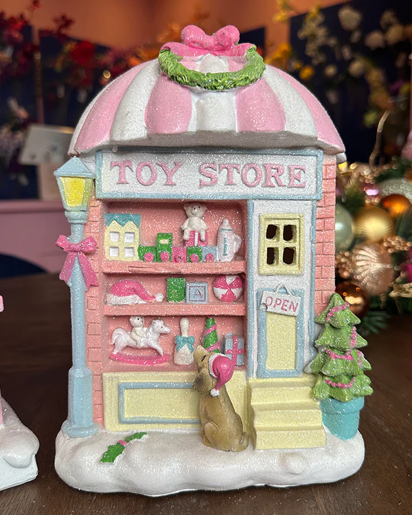 Figurinë Dekorative Krishtlindjeje – Dyqani i Lodrave.Shtoni një prekje festive dhe nostalgjike në dekorin tuaj me këtë figurinë të bukur Krishtlindjeje, e dizajnuar si një dyqan lodrash në stil vintage.Dyqani i lodrave ka një tendë rozë dhe të bardhë, duke krijuar një pamje të ngrohtë dhe tërheqëse.Një qeni i vogël me kapelë Santa qëndron pranë shkallëve, dhe një pemë e vogël Krishtlindjeje qëndron jashtë dyqanit.Rafte të mbushura me lodra të vogla, duke përfshirë arushin, kalin lëkundës dhe blloqet e ndërtimit.Shkronja “TOY STORE” mbi derë dhe shenja “OPEN” për një efekt realist dhe joshës.
